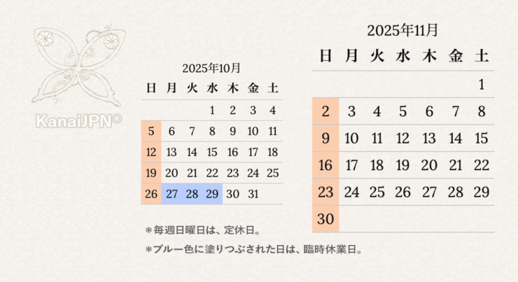 ホームおしらせ ■2025年11月 休業日のおしらせ 2025年10月24日 2025年11月 休業日のおしらせ *定休日(毎週日曜日)2日、9日、16日、23日、30日 *休業日でもウェブショップでのご注文は可能ですが、受注対応、発送、メール返信などすべての業務はお休みとなります Kanaiプレートアート 天ジュラム カミサマカンカン 才能アプリ KANAI SHOP Facebook公式ページ